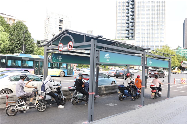 相比于此前的旧款遮阳棚,新款遮阳棚按照功能优先、安全美观的原则,采用双立柱的结构,稳定性更强。同时,结合杭州台风多发的季节特点,兼顾考虑道路安装条件和空间视觉效果,选用了可拆卸式遮阳棚,拆装方便、建筑费用低、城市空间的通透性好。棚体设计提取了杭州西湖断桥、古亭飞檐等元素,棚顶使用与杭州城市ayx爱游戏官方app平台入口相协调的蓝绿色高清喷绘布,全方位体现了西湖元素、杭州韵味。