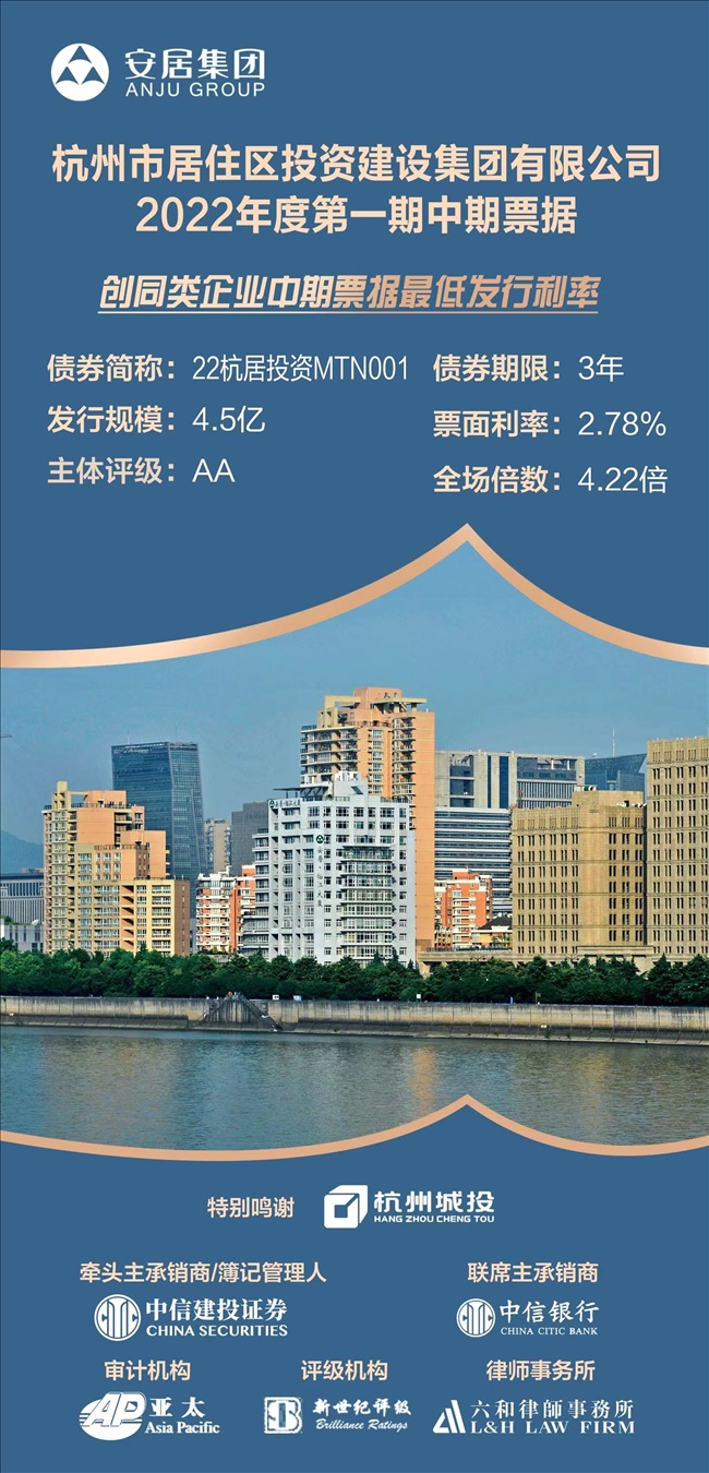 10月28日,市安居集团成功发行2022年度第一期中期票据。本期债券发行规模4.5亿元,期限为3年,票面利率2.78%,创同类企业中期票据最低利率。