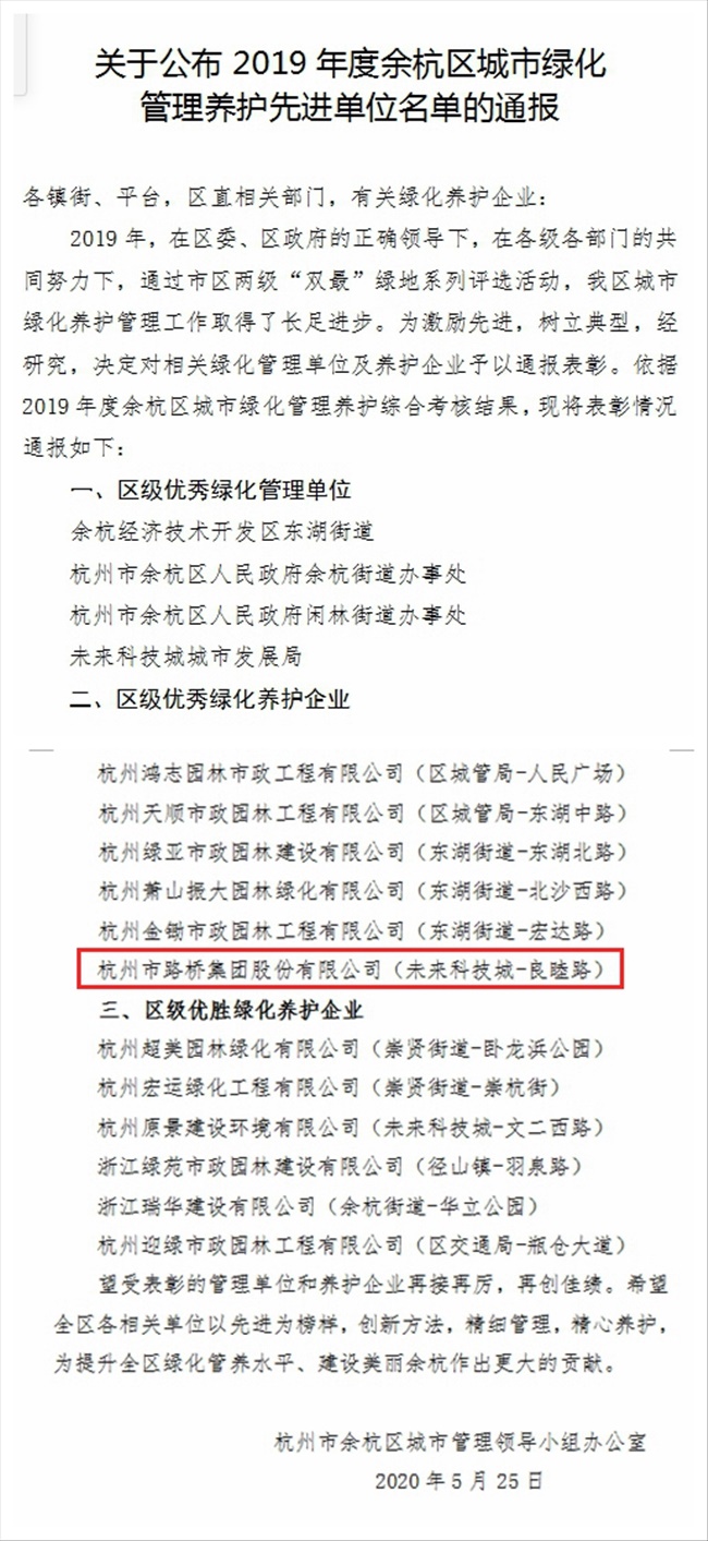 市路桥集团斩获“余杭区优秀绿化养护企业”称号